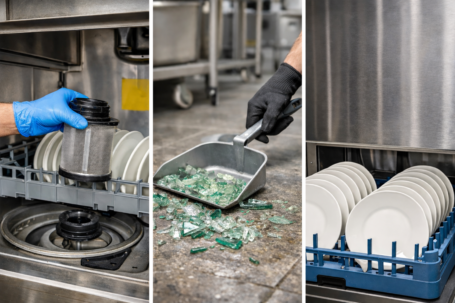 Il est 12 h 07. Le coup de feu démarre. Les paniers s’enchaînent. Soudain, la machine s’arrête. Odeur de chaud, voyants qui clignotent. Dans la cuve, des éclats brillent. Un bris de verre lave-vaisselle professionnel vient de mettre le service en tension.